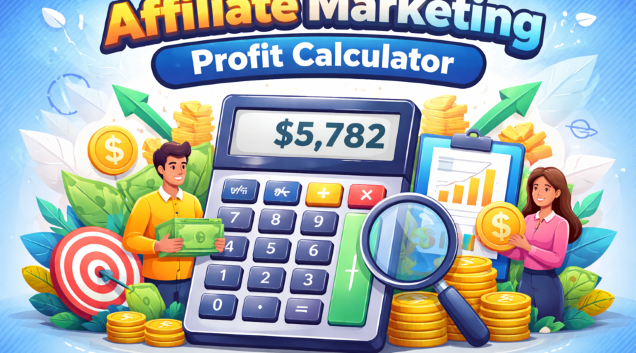 Illustration of a large calculator displaying $5,782, surrounded by coins, charts, target, and two people holding money and a coin, with the text "Affiliate Marketing Profit Calculator" at the top.